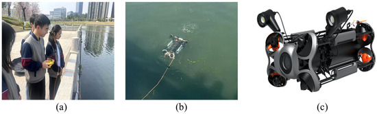 Underwater image acquisition setup using a submersible robot. (a) Robot control; (b) robot underwater work; (c) robot. The imaging system supports maximum depths of 200 m and operation radius up to 400 m, equipped with a 4K-resolution camera (also supporting 1080p@120fps and 720p@240fps). High-intensity 8000-lumen LED lights with a 150° illumination angle and adjustable brightness provide consistent lighting in turbid water. The system ensures ≥2 m visibility in 5 NTU water and ≥1.5 m in 60 NTU water, enabling reliable high-resolution capture under realistic inspection conditions.