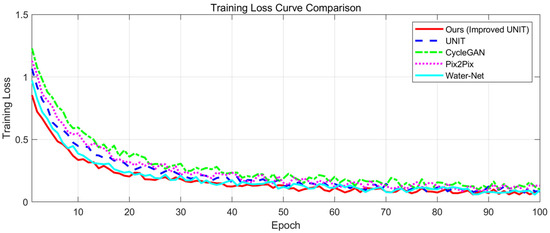The training loss of the proposed method and baseline model is shown in Figure 5. During the training phase, the total loss of the model consists of multiple components, including reconstruction loss, adversarial loss, style consistency loss, and cyclic consistency loss. From the training curve (as shown in Figure 7), the following points can be observed: (1) Rapid convergence: Within the first 20 epochs, the reconstruction loss and total loss decrease rapidly, indicating that the improved encoding decoding structure has good initialization and convergence. (2) Stability enhancement: Thanks to the introduction of PatchGAN discriminator and multi-scale feature preservation module, the overall training process has less fluctuation and the model optimization process is smoother. (3) Stable Adversarial Learning: The absence of severe oscillations in adversarial losses indicates a good game balance between the generator and discriminator, validating the effectiveness of introducing shared hidden spaces and reconstructing consistency losses in the network structure. It is worth mentioning that in underwater crack image enhancement tasks, optimizing stability is crucial as the original image is often affected by light scattering and blurring. From the loss curve, it can be seen that the proposed method has strong anti-interference ability and good adaptability.
