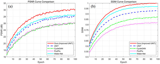 Training curve comparison of PSNR and SSIM. (a) PSNR curve comparison; (b) SSIM curve comparison.