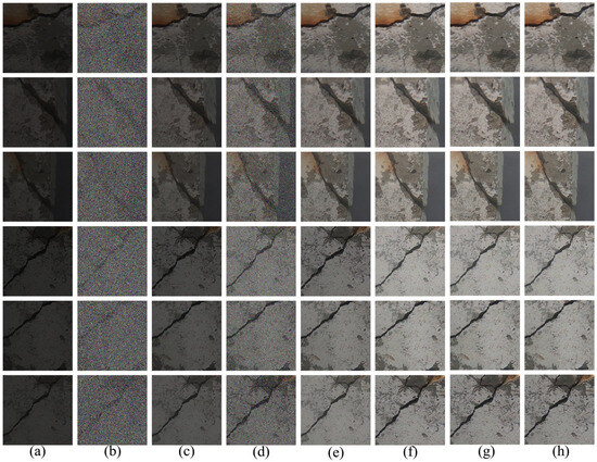 Figure 10 visually compares enhancement results from different methods on three representative underwater crack images. The figure illustrates a visual comparison of enhancement results across multiple methods: (a) represents the original image, while (b) to (h) showcase the outcomes of Retinex-Net, UWCNN, WaterGAN, UNIT, Restormer, U-Former and the proposed method, respectively. An analysis of each method’s performance in terms of noise reduction, detail preservation, and image quality enhancement is as follows: