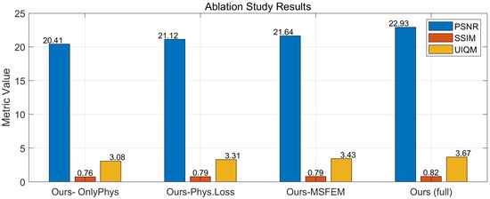 Results in Table 3 and Figure 12 confirm that both the physics-aware loss and the multi-scale feature enhancement module contribute significantly to the final performance. The absence of either module leads to a noticeable drop in PSNR and UIQM scores, highlighting their effectiveness in guiding physically consistent learning and enhancing crack texture details, respectively.