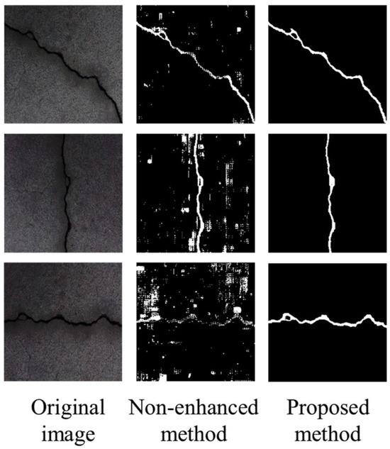 Fifty newly collected low-quality images were used to test the enhancement effect of the proposed model. The evaluation indicators PSNR, SSIM, UIQM, and EPI of the test results were 22.93, 0.821, 3.67, and 0.712, respectively, showing excellent testing results. Figure 9 shows an enhanced case effect, which demonstrates that the proposed method can achieve color and contrast enhancement of low-quality images and higher visibility of cracks.