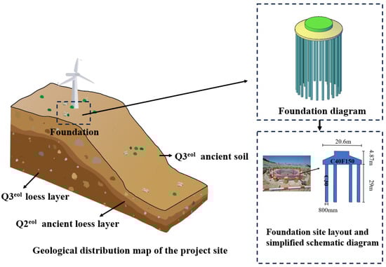Northwest China is a wind energy-rich region, where wind intensity is generally high. Therefore, studying the pile–soil response mechanisms under wind loading is essential. Most studies primarily focused on pile–soil interaction under vertical loads, providing a basis for subsequent research on wind loading. For example, in Liu’s study [1], the load transfer mechanism of a single pile was revealed, which marked a significant breakthrough. This study confirmed that the core parameter of the load transfer function is pile displacement, not the relative pile–soil displacement or pile compression. The research also derived prediction formulas for pile skin friction and axial pile load by correcting misconceptions in traditional models. Building on this, many further studies have come out. Alsharedah et al. [2] explored the behavior of a single pile supporting a 5-MW wind turbine under a horizontal load using a nonlinear three-dimensional finite element model. It was found that pile performance was influenced by soil strength and the embedment depth-to-diameter ratio (L/D). The bending moment profile near failure load demonstrated flexible pile behavior even at low L/D ratios, challenging the traditional assumption of pile rigidity. Zuo et al. [3] investigated the dynamic response of offshore wind turbines in operation, with particular focus on soil-structure interaction effects on foundation fatigue performance. The research indicated that accounting for soil-structure interaction enables more accurate foundation fatigue life assessment. Liu et al. [4] investigated the effects of aerodynamic imbalance, induced by blade pitch angle errors (PAEs), on the fatigue performance of embedded steel ring (ESR) foundations for onshore wind turbines (WTs). The study demonstrated that aerodynamic imbalance accelerates foundation fatigue damage through amplified load amplitudes and stress fluctuations, providing critical theoretical support for the design, operation, maintenance, and standardization of onshore wind turbine foundations. Xia [5] separately examined dynamic and static wind load effects on transmission tower foundation stability, demonstrating that static wind load simulations can yield reliable stability analysis results.