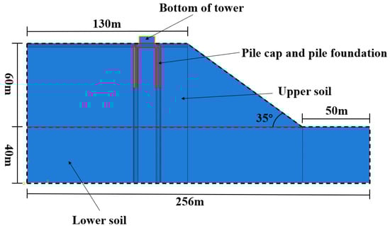 The tower foundation is modeled at a 1:1 scale. In order to minimize the influence of boundary effects, the height of the model is 100 m, which is more than three times the depth of the pile foundation, and the upper boundary is 130 m long. The adjacent slope to the wind turbine foundation has a height of 60 m with a 35° inclination angle, as detailed in Figure 3.