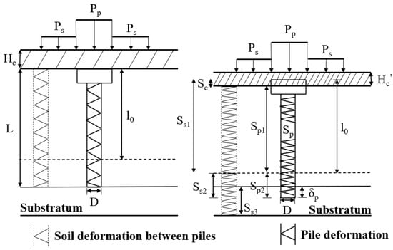When , is the deformation of the pile top inserted into the cushion, is the compression deformation of the pile above the neutral point, and is the compression deformation of the soil between the piles. Therefore, the following is true: