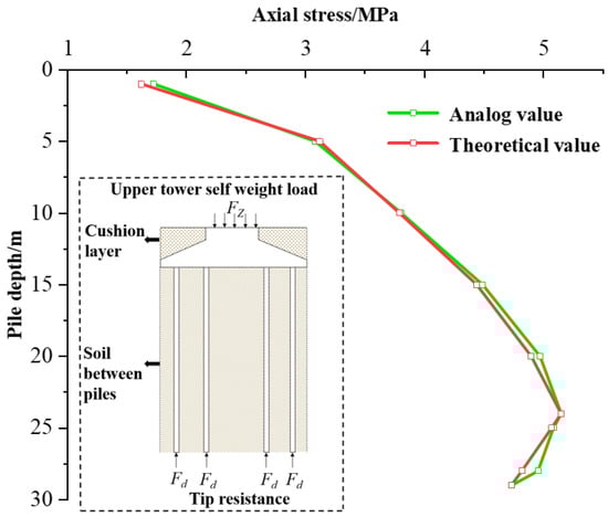 In order to facilitate the calculation, the average axial stress of the pile group is taken as the comparison index in this study. The average axial stress of the pile group of the wind turbine tower foundation under the self-weight load is calculated through Formula (19) and numerical simulation, and the accuracy of the numerical simulation is verified by comparison. The comparison results are presented in Table 4.