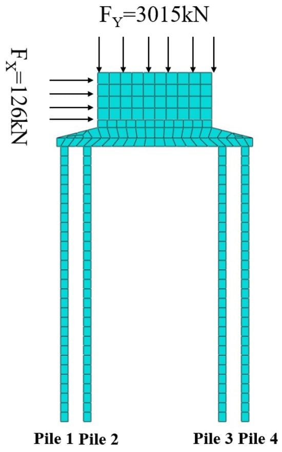 To enhance computational efficiency, the pile group and cap are modeled as a unified system. Accordingly, all subsequent axial stress distribution analyses represent averaged values across the pile group.