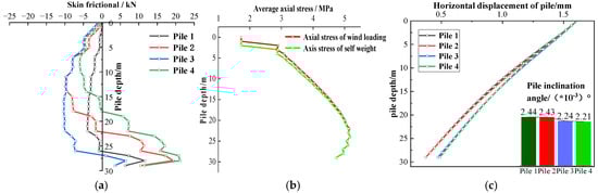Compared to the self-weight condition, shown in Figure 8b, the pile group under wind loading exhibits higher average axial stresses, particularly within the 0–5 m depth range, where stresses increase by up to 7.58% due to wind-induced overturning moments. With increasing depth, this bending effect is progressively transferred to the surrounding soil, leading to stress stabilization below 20 m. The maximum axial stress within the pile reaches 5.15 MPa.