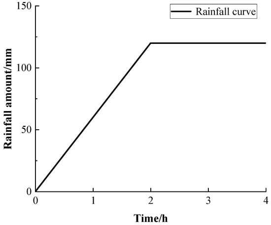 Based on the rainfall characteristics of the Ansai region and experimental data from Zhen et al. [9], the short-term extreme rainfall conditions in this region are simulated with a maximum rainfall intensity of 120 mm/h and a duration of 4 h. The rainfall curve is shown in Figure 9.