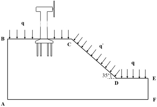 In this study, the horizontally applied wind load (left to right direction) induces an overturning tendency at the pile foundation top. The lateral constraint of the pile foundation near the slope side is weak, and the foundation soil may have plastic deformation or looseness, making the pile more prone to tension or lateral slip, increasing the risk of overall instability. Considering that normal operating load conditions represent the most frequent working state of wind turbine towers, the cumulative damage caused by repeated loading often plays a dominant role in structural degradation. Therefore, the pile–soil interaction of a wind turbine tower under normal operating wind loads is focused on in this study. To simulate the wind load realistically, it is applied as a pressure-based distributed load on the structural surface in ABAQUS. Field survey data indicate that the final horizontal force on the top of the foundation is 126 kN, and the vertical force on the top of the foundation is 3015 kN, as shown in Figure 7.