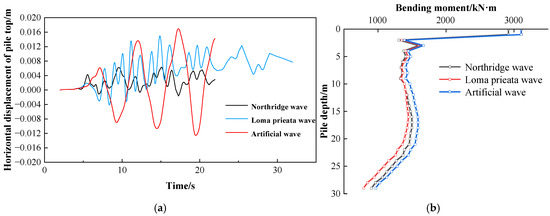 Time–history curves of pile top displacement and pile body bending moment diagram under different seismic loads: (a) Time–history curve of horizontal displacement at pile top; (b) pile bending moment diagram.