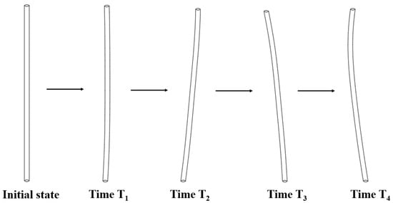 Analysis of pile–soil interaction mechanisms under artificial seismic loading (see Figure 14) reveals that the neutral point occurs near 17 m depth. Figure 14a,b shows a soil stiffness evolution characterized by softening and subsequent recovery. At the time of peak ground acceleration (T2 = 8.829 s), significant soil softening around the pile reduces positive skin friction to a minimum of 18.69 kN, while inertial effects induce maximum axial stress (5.47 MPa) in the pile. By the midpoint of the energy duration (T3 = 12 s), the rearrangement of soil particles reestablishes the interparticle frictional structure, increasing lateral skin friction by from 17.28% to 21.92 kN and reducing peak average axial stress by 11% due to enhanced soil constraints. Figure 14c shows delayed pile displacement response, with maximum horizontal displacement (10.07 mm) occurring at vibration attenuation completion (T4 = 18 s), while maximum average inclination (0.00628°) appears at T3. This demonstrates the dynamic equilibrium of pile oscillation during soil stiffness recovery, further corroborated by seismic deformation patterns in Figure 15.