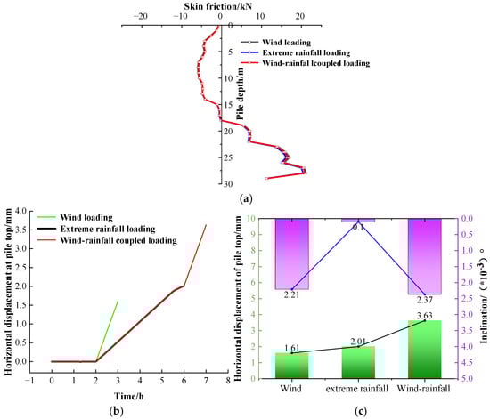 Time–history diagram of pile–soil interaction mechanisms under coupled wind–rainfall loading: (a) skin friction curve diagram along pile depth; (b) time–history curve of horizontal displacement of pile top; (c) pile displacement inclination diagram.