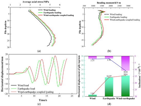 Time–history diagram of pile–soil interaction mechanisms under coupled wind–earthquake loading: (a) average axial stress diagram along pile depth; (b) pile bending moment diagram; (c) time–history curve of horizontal displacement at pile top; (d) pile displacement inclination diagram.