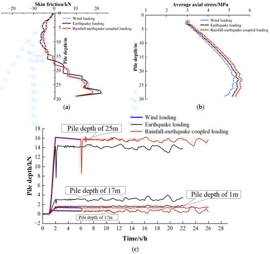 Time–history diagram of pile–soil interaction mechanisms under coupled rainfall–earthquake loading: (a) skin friction curve diagram along pile depth; (b) average axial stress diagram along pile depth; (c) skin friction time–history diagram.