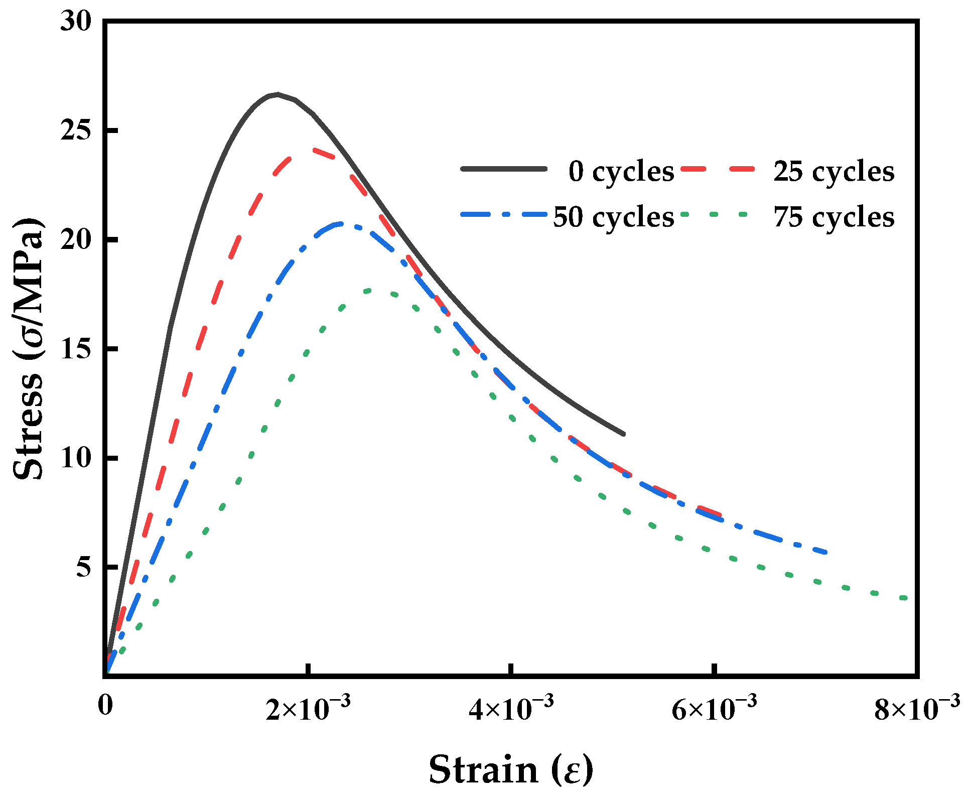 | Freeze–Thaw Cycles (N) | Peak Stress (σ/MPa) | ||