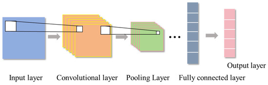 The Convolutional Neural Network (CNN), introduced by Lecun et al. in 1998, represents a distinct variant of feedforward neural networks. Its architecture encompasses convolutional layers, pooling layers, and fully connected layers, exhibiting characteristics such as local connectivity and weight sharing, as illustrated in Figure 1 [31]. Within the convolutional layer, convolution operations are executed on multi-feature input data utilizing kernels to extract pertinent features. Subsequently, the pooling layer reduces the dimensionality of the input data, thereby decreasing computational load while retaining crucial features. Ultimately, the fully connected layer integrates the outputs from both the convolutional and pooling layers to produce the ultimate classification outcomes or regression values [32]. The training process of CNN typically uses a backpropagation algorithm to update weight parameters. The convolutional layer calculation formula is as follows:
