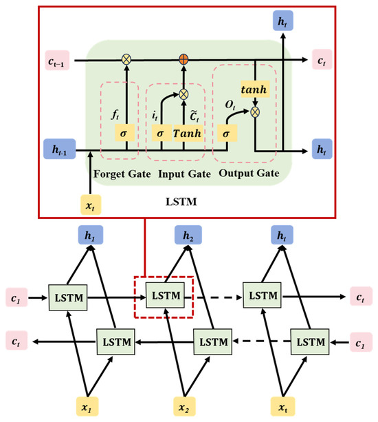 Long Short-Term Memory (LSTM) networks represent an advanced form of Recurrent Neural Networks (RNNs), extensively employed for the analysis of sequential data [33]. In contrast to conventional RNNs, LSTMs excel at capturing long-range dependencies within sequences and alleviating problems such as vanishing or exploding gradients. This enhanced capability stems from the incorporation of gating mechanisms, comprising forget gates, input gates, output gates, and a memory cell. These gates regulate the movement of information, enabling LSTMs to selectively preserve or disregard information during sequence processing. By leveraging this gating architecture, LSTMs achieve greater flexibility in capturing long-term dependencies within sequential data and effectively tackle the challenges posed by vanishing or exploding gradients. The internal configuration of LSTM units is depicted in Figure 2. The detailed mathematical expressions underpinning LSTM network operations are provided as follows: