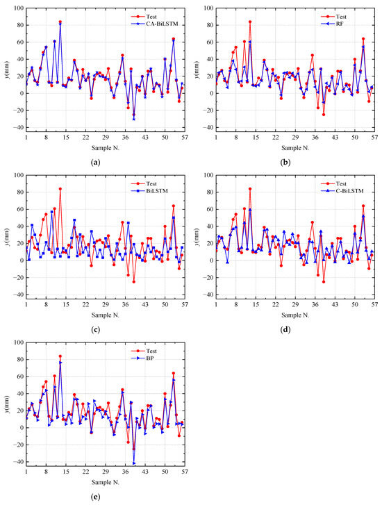 Pre-camber prediction results. (a) CA-BiLSTM prediction results. (b) RF prediction results. (c) BiLSTM prediction results. (d) C-BiLSTM prediction results. (e) BP prediction results.