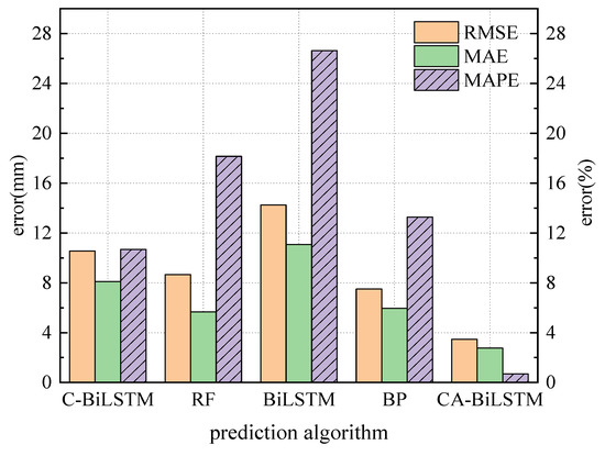 The evaluation metrics for the prediction outcomes of various models are presented in Figure 7 and Table 4. Table 4 shows that the RMSE of the BiLSTM, CNN-BiLSTM, Random Forest, and BP prediction models are ranked from highest to lowest as 14.24 mm, 10.56 mm, 8.66 mm, and 7.50 mm, respectively. The RMSE of the proposed model in this paper is 3.47 mm, which is lower than the RMSE of the other four prediction models. Regarding MAPE and MAE, the proposed model in this paper has the lowest prediction errors. In Figure 7, RMSE and MAE correspond to the numerical values on the left axis, while MAPE corresponds to the right axis values. Overall, the proposed CNN-BiLSTM-Attention prediction model in this paper outperforms the Random Forest, BP, BiLSTM, and CNN-BiLSTM models in terms of MAPE, RMSE, and MAE evaluation metrics, demonstrating significant advantages in predicting pre-camber in construction processes.