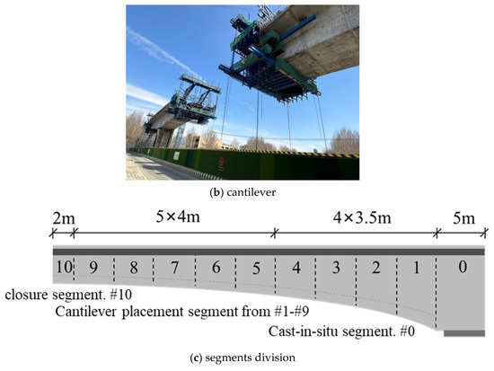 The bridge used in this study (as shown in Figure 8a) is located in Liaoning Province, China. It is a prestressed concrete continuous girder bridge with a total length of 176 m and a span configuration of (48 + 80 + 48) meters. It adopts a single-box single-chamber variable cross-section form, top girder width of 10.4 m, bottom girder width of 5.6 m, and a flange length of 2.4 m. The bottom plate varies according to a parabolic curve, with the top section height of the main pier being 4.8 m, and the section height of the mid-span and side-span being 2.5 m. Due to the presence of an existing bridge over the upstream river and to meet the span requirements without affecting normal traffic under the bridge, a balanced cantilever casting method using a hanging basket was adopted for construction (as shown in Figure 8b). The maximum cantilever girder consists of nine segments, with segments 1–4 being 3.5 m long, segments 5–9 being 4 m long, the side-span cast-in-place segment being 7.0 m long, and the closure segment being 2 m long (as shown in Figure 8c).