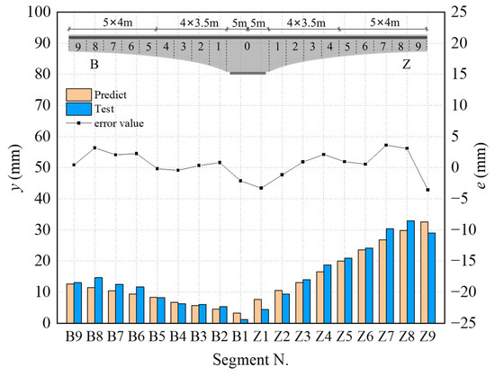 The CNN-BiLSTM-Attention model established has been successfully applied to predict the pre-camber of on-site continuous girder bridges. Using the CNN-BiLSTM-Attention model, on-site experimental parameters for pre-camber prediction are input and compared with on-site monitoring results, as shown in Figure 9. In Figure 9, the left coordinate axis represents pre-camber values, corresponding to the bar chart, indicating the comparison between predicted values and on-site measured pre-camber; the right coordinate axis represents pre-camber error values, corresponding to the line graph, indicating the error values of the pre-camber for each section. Here, B denotes the edge span side of the continuous girder bridge, and Z denotes the mid-span side of the continuous girder bridge.