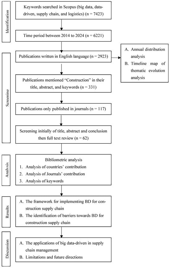 The research approach shown in Figure 1 is a systematic multi-phased process including stages of identification, screening, analysis, and discussion. The process of identification started by launching an extensive Scopus core database search with four specific keywords—“big data,” “data-driven,” “supply chain,” and “logistics”—and produced 7423 preliminary records. On application of the filter for publication time (2014–2024), only 6221 papers were left. A dataset of 2923 was formed on filtering in terms of journal articles being in the language of English. These documents were utilized for yearly distribution analysis and thematic evolution timeline map to display the evolution and changing interest of research on BDD in the field of supply chains. The screening process undertaken included three complementary filtering steps: (1) the selection of 331 papers with an explicit occurrence of “construction” in the same line of their title, abstract, and keywords; (2) filtering to 117 journal publications in only journals with excluding of conference publications; and (3) application of specific contents through full-text and abstract screening, which gave 62 final papers. These shortlisted studies were subjected to bibliometric analysis in terms of country and journal contribution and keyword co-occurrence. From all these analyses, a framework for implementing BDD in CSCM is presented and five major barriers are determined. Then, the main application fields of the BDD in CSCM were discussed. Finally, limitations and future research directions are stated.