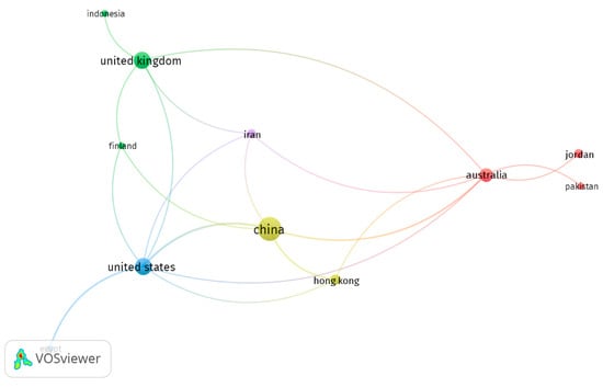 Figure 4 demonstrates the connections between countries and publications using a co-authorship network created with VOSviewer version 1.6.17 and a minimum of two articles published. Nodes represent countries and their relative contributions, and links show co-authorship or collaboration strength. From the network map, the global collaboration on the application of BD in construction supply chains can be seen, with interactions among major countries included. The major nodes of China, the United Kingdom, Australia, and the United States represent areas of significant contribution or leadership. Dense links, like those between the United States and China, indicate effective partnerships in BD technology development. On the other hand, smart city initiatives or integrated supply chain systems may appear in relation to regional cooperation, like between China and Hong Kong. A worldwide effort to use BD in CSCM is highlighted by links with different nations like Indonesia and Iran, which indicate opportunities for knowledge-sharing initiatives in the digitalization of the construction supply chain.