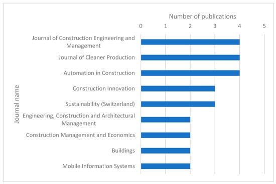 These publications are published in more than 45 different journals. Figure 5 illustrates the distribution of publications related to BD in SCM in journals that contributed more than 2 publications. The top three journals—the Journal of Construction Engineering and Management, the Journal of Cleaner Production, and Automation in Construction—have the highest number of publications with four documents, which primarily focused on construction and engineering disciplines, with a distinct emphasis on technological advancements and sustainability.