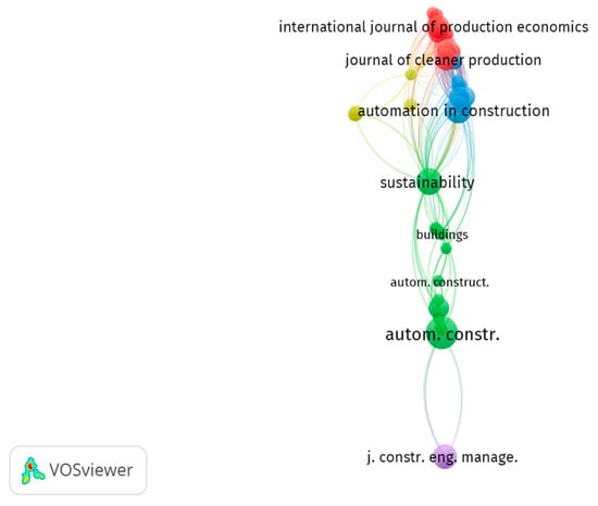 By using VOSviewer version 1.6.17 software with a minimum number of citations of 10 per journal, a journal co-citation network was generated as shown in Figure 6, showing how journals connect to these 62 publications. Larger nodes, such as Automation in Construction, the Journal of Cleaner Production, and Sustainability, indicate that these journals have high co-citation counts, reflecting their central influence in this research area and showing strong relationships with other journals through shared citations.