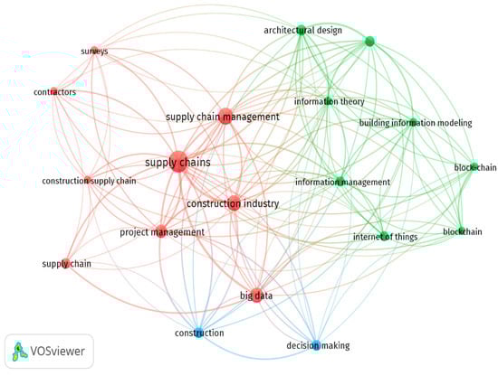 In any field, the co-occurrence of keywords is one of the most significant factors that determines how research grows. In this regard, the keywords of the retrieved documents were considered with 5 occurrences of a keyword as a minimum. As shown in Figure 7, there are three clusters distinguished by color. The first cluster is red in color and includes but is not limited to “supply chains,” “supply chain management,” and the “construction industry”. However, the green cluster that focuses on the “internet of things,” “building information modeling,” and “blockchain” reflects the integration of advanced digital tools to enable BDD decision-making and transparency. Finally, the blue cluster that includes keywords like “decision making,” and “construction” showcases the critical role of analytics in improving efficiency and achieving better project outcomes. The connections between these clusters illustrate how BD technologies integrate SCM with advanced tools and systems, fostering innovation and driving advancements in construction management.