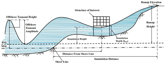Sequential natural disaster events are becoming frequent in different places across the globe. The common sequential events so far are earthquakes and aftershocks, earthquake and fire, cyclone and hurricane, hurricanes and earthquakes (in Southern California on 20 August 2023), volcanic eruption and landslide-triggered tsunami (Java Sumantra volcanic eruption-triggered landslide and tsunami 2018, Indonesia Java Island on 4 December 2022), subsea earthquake and tsunami (India Ocean tsunami 2004, Pangadaran earthquake and tsunami at South of Java Island 2006, Great Japan tsunami 2011, Philippines tsunami 2012), etc. Tsunamis are devastating natural phenomena known for their immense intensity and widespread impact on human lives. The 2004 Indian Ocean tsunami, triggered by a massive 9.3-magnitude undersea earthquake, exemplifies the catastrophic potential of these events. This catastrophic event claimed over 230,000 lives across 12 countries in the Indian Ocean [1]. This tsunami inundated coastal communities with run-up to a maximum distance of 5 km into the shore, and the inundating depth varied from 9.0 m near the shoreline and 7.0 m to 3.0 m in the coastal areas, depending upon the distance from the shoreline. In 2010, the Chilean coast was struck by a similar tragedy when an offshore earthquake of magnitude 8.8 caused a tsunami that claimed 521 lives [2] and destroyed most of the non-engineered structures. Though the toll was lower compared to the Indian Ocean disaster, the impact was nevertheless significant on the infrastructure, highlighting the lethal potential of tsunamis. The 2011 Great Japan Earthquake (also known as the Tohoku earthquake) and tsunami further highlighted the catastrophic impact of tsunamis, resulting in nearly 19,000 fatalities; 6000 injuries [3]; and the collapse of over 121,000 buildings. The staggering economic toll, estimated at USD 235 billion [4], exemplifies the profound socio-economic ramifications of these disasters. This tsunami affected various sectors such as fisheries, agriculture, tourism, supply chain mechanisms, electric power, industrial production, and insurance companies of various public and private organizations. Coastal cities worldwide face significant tsunami risks, with approximately 60% identified as vulnerable by the United Nations [5]. Governments and policymakers in growing cities of coastal areas should be aware of tsunami preparedness. Global population growth has doubled over the past 40 years [6], and especially in coastal areas, the population growth is more. Researchers are familiar with seismic activities due to extensive prior research. However, the limited research on tsunami analysis results in unfamiliarity with or unawareness of preparedness. This unfamiliarity necessitates a visual representation (Figure 1) to understand terms associated with tsunamis.