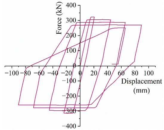 A sequential time history analysis is performed by considering the nonlinear behavior of the building material. The material nonlinearity is incorporated using a hysteresis curve generated for a concrete column of size 0.35 m × 0.35 m [28] under lateral loads (Figure 3).