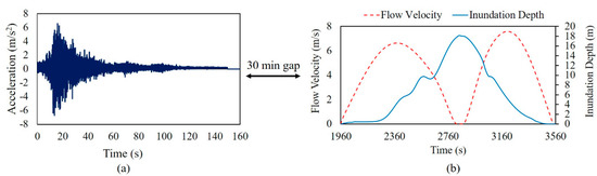 (a) Ground acceleration time history of the 2011 Japan Earthquake (California Geological Survey & U.S. Geological Survey, 2005) [38]; (b) Video recording data of tsunami flow velocity and inundation depth at Fujitsuka, Japan, during the 2011 Tsunami [37].