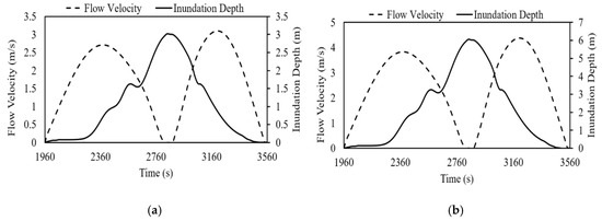 The characteristics of tsunami flow are scaled down to simulate flow for the inundation depths of 6.0 m and 3.0 m. The Froude scaling law is used to scale down the inundation depth (Equation (12)) and flow velocity (Equation (13)). The scaled-down inundation depth and flow velocities with respect to time, for the scale ratios of 6 and 3, are shown in Figure 6a and Figure 6b, respectively. The selected inundation depths are considered to represent near-shore and far-shore locations of the structures. The structure that is inundated at a depth of 6.0 m is nearer to the shore than the structure inundated at a depth of 3.0 m. In the case of an inundation depth of 3.0 m (Figure 6a), the flow velocity varied from 0.0 m/s to 2.6 m/s during the run-up. After reaching the maximum inundation depth, the direction of the tsunami changed towards the shore, and the recede flow velocity increased up to the peak of 3.0 m/s. Later, the flow velocity decreased to 0 m/s as the inundation depth was reduced to 0.0 m. The run-up flow velocity is increased from 0 m/s to 3.79 m/s, and the receding flow velocity is increased from 0 m/s to 4.39 m/s when the inundation depth is 6.0 m (Figure 6b).