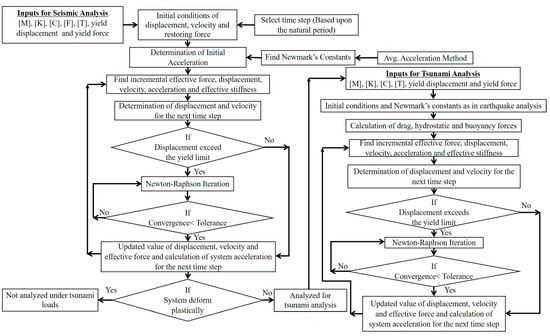 Newmark’s beta method is used to solve the nonlinear equation of motion (Equation (1)). A MATLAB code is developed using the average acceleration method at each time step. The choice of MATLAB provides an efficient platform for customized numerical analysis, including implementation of Newmark’s β method, nonlinear material modeling via user-defined hysteretic laws, and the Newton–Raphson method. The most important thing for choosing MATLAB is to assign the tsunami flow characteristics during the tsunami analysis. The Newton–Raphson iteration technique [29,30] is used at each time step to consider the material nonlinearity. Convergence was checked based on the residual norm of the force vector, with a tolerance of 1 × 10−3. Iterations continued until the residual fell below this threshold. Furthermore, to ensure accurate dynamic response capture, the time step was selected as less than one-tenth of the fundamental period of the structure, as recommended in dynamic analysis best practices.
