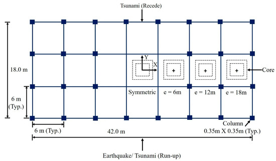 A 10-story RC building with a longitudinal dimension of 42.0 m and a lateral dimension of 18.0 m is selected for the study. The columns in the building are uniformly spaced at an interval of 6 m in both the longitudinal and transverse directions, as shown in Figure 8. Each column has dimensions of 0.35 m × 0.35 m, while the core has a width of 3.0 m and a breadth of 2.5 m, with a wall thickness of 0.20 m. Each floor maintains a height of 3.0 m. Parameters such as the modulus of elasticity (30,000 N/mm2) and concrete density (25 kN/m3) are factored to assess dead load and stiffness matrix elements. Each floor bears a dead load of 7.06 kN/m2, encompassing the weight of peripheral walls, slab, beams, lintels, partition walls, and other structural elements. A live load of 3.5 kN/m2 is considered for all the floors, and 1.75 kN/m2 of live load is applied on all floors for the sequential analysis. The building’s plan asymmetry is simulated by varying the eccentricity to 6 m, 12 m, and 18 m. The present study conducts a sequential time history analysis under the ground acceleration of the 2011 Great Tohoku earthquake and Japan tsunami. The ground acceleration record of a massive 9.1-magnitude earthquake is shown in Figure 4. Initially, the structure is analyzed under the earthquake ground acceleration time history. The nonlinearity of the material is considered to assess the yielding of SE structural members on each floor. The earthquake force is applied in the perpendicular direction of the longitudinal axis of the building, as shown in Figure 8. As the structural relative stiffness is lower in the lateral direction when compared with the longitudinal direction, the load application is selected in the lateral direction of the building. Newmark’s Beta method and the Newton–Raphson iteration technique are used to solve the equation of motion (Equation (1)) at each time step. Initial conditions of zero velocity and displacement are applied at the beginning of the analysis to account for no displacement in the structure before the ground acceleration. The acceleration is estimated for the second time step under the load. Structural velocity and displacement are evaluated for the second time step. The above process is repeated for the entire analysis, considering the material nonlinearity under the earthquake and tsunami. The time history of the force and moment on the first floor during the sequential analysis of the earthquake and tsunami for the symmetric and plan asymmetric building with 6 m eccentricity are shown in Figure 9a and Figure 9b, respectively. The force and moment are evaluated under the earthquake ground acceleration and tsunami inundation depths of 3.0 m and 6.0 m. The response time history in the lateral direction under the earthquake is shown in Figure 10 for the symmetric and plan asymmetric buildings.