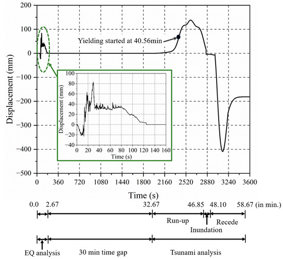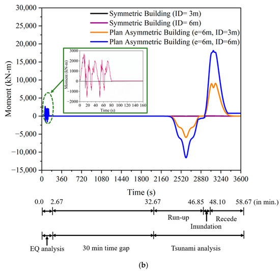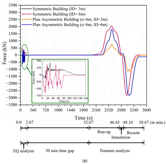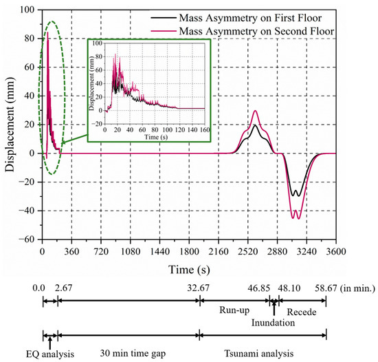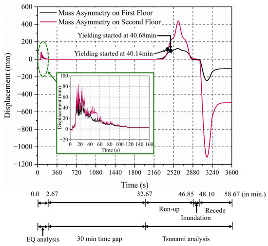The initial scenario, where the buildings are far from the seashore, demonstrated sufficient resilience against sequential forces. To investigate deeper into the behavior of the vertical mass asymmetric buildings under severe conditions, an inundation depth of 6.0 m is considered. The time history response of the sequential analysis is shown in Figure 19. Initially, both buildings successfully resisted the forces of the earthquake. However, with a gap of 30 min after the event of an earthquake, the buildings are subjected to tsunami loading. This sequential analysis revealed that the building with mass asymmetry on the first floor responded with a structural adequacy up to 2440.89 s (40.68 min). In comparison, the mass asymmetry on the second floor showed a structural adequacy up to 2408.13 s (40.14 min). Both the mass asymmetric systems showed closer structural adequacy (i.e., just a 0.54 min difference). Both the structures yielded during the tsunami run-up due to the increased drag force and inundation depth. The inundation depth is about 2.0 m and the tsunami flow velocity is about 3.85 m/s during the yielding of the structure.