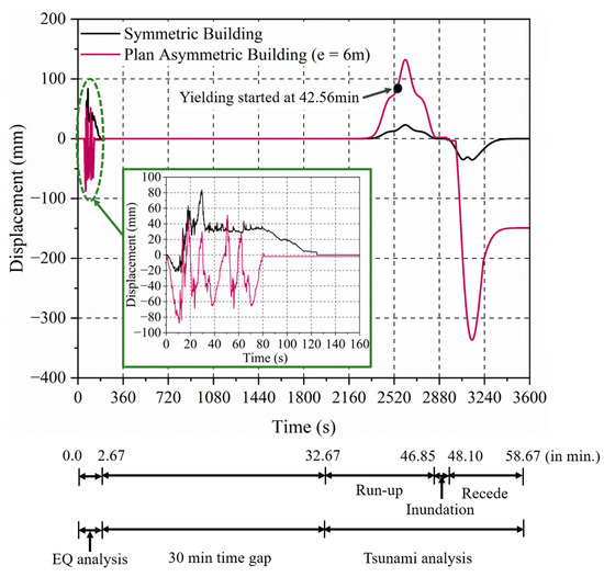 The earthquake event takes place for 160 s (Figure 4). A time gap of 30 min is observed in the field during the event. Hence, the same is considered in the sequential analysis. The seismic ground acceleration is applied up to 150 s, and no force is applied to the structure in further steps. The response curve shows that the structural response for symmetric and asymmetric structures with 6.0 m eccentricity is reduced, stating that the building is returning to its original condition by approximately 160 s. This behavior is observed due to the damping present in the structures. A sequential analysis under tsunami loading with maximum inundation depths of 3.0 m and 6.0 m is performed. The sequential responses of symmetric and asymmetric buildings with 6.0 m eccentricity are shown in Figure 11. For the symmetric building with a 3.0 m inundation depth, the response history in Figure 11 indicates that the response of the structure under seismic and tsunami forces is within acceptable limits, as the displacements remain below the yield value. Thus, the studied symmetric building can withstand the combined effects of the earthquake and the subsequent 3.0 m tsunami inundation, demonstrating adequate resilience under these conditions.