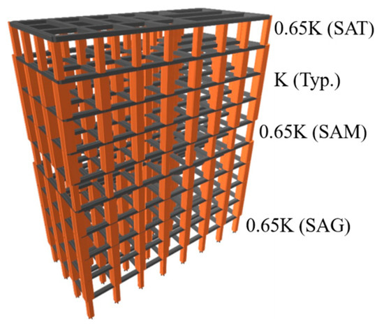 The study examines a distinct form of vertical asymmetry in buildings, focusing on their stiffness during seismic and tsunami events. According to the Indian Standard, IS 1893 (Part 1): 2002 [36], the stiffness asymmetric story is defined as a story that has a lateral stiffness lower by 70% of the story above it or 80% of the average of the three stories above the floor. A lateral story stiffness of 65% is considered in the soft story. The stiffness asymmetry in a particular story is achieved by reducing the column dimensions and core wall thickness. Three key locations are targeted for inducing stiffness asymmetry, i.e., the ground story (SAG) and middle story (SAM). Another case of lower stiffness on the top story (SAT) is also considered to account for the cost reduction of the building. The considered stiffness asymmetric cases are shown in Figure 14.