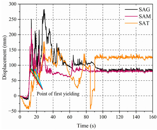 The initial step in assessing vertical stiffness asymmetric buildings involves analyzing their performance during an earthquake. This analysis aims to identify which building models could withstand the forces experienced during the 2011 Great Tohoku earthquake. The intention is to filter out models that fail under these conditions before proceeding to a more detailed sequential time history analysis, including earthquake and tsunami loadings. The lateral response time histories of the buildings for the first floor are illustrated in Figure 15. The analysis revealed that the lateral responses of all three cases exceeded the yield limit of the structural material. Exceeding these limits indicates that the buildings have undergone plastic deformations even after removing the earthquake load. Since all the analyzed building cases exceeded the yield limits during the earthquake, it implies that these structures would not remain intact if subjected to additional forces, such as those from a sequential tsunami loading. Therefore, conducting a sequential analysis, which assesses the building’s performance under earthquake forces followed by tsunami forces, is deemed illogical and unrealistic. If the buildings are already failing under earthquake forces, they are unlikely to survive the additional forces imposed by a tsunami. Hence, analysis under sequential tsunami loading is not performed for the vertical stiffness asymmetric buildings.