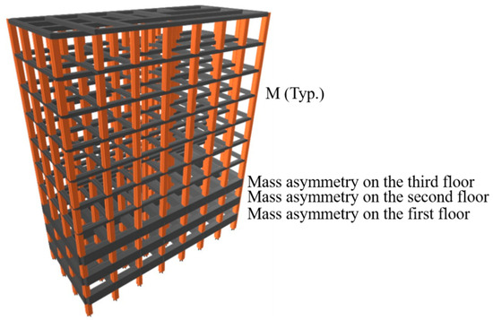 Building models with vertical mass asymmetry on the first, second, and third floors.