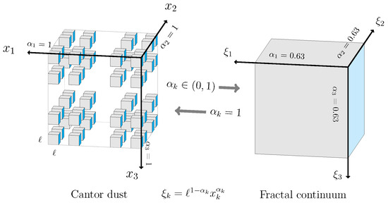Figure 2. A schematic representation of tri-dimensional Cantor dust in Cartesian coordinates and its counterpart fractal continuum in fractional coordinates. - ii