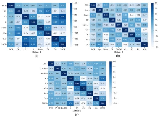 - Dataset 1 (DS1): This dataset was sourced from the study by Zheng et al. [33]. To reduce dimensionality, 8 out of the 16 original input variables were selected: cement strength (CCS), water (W), cement (C), slag (S), fly ash (F-ash), coarse aggregate (CA), fine aggregate (FA). The output variable is the 28-day compressive strength of concrete (28CS).