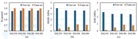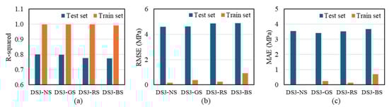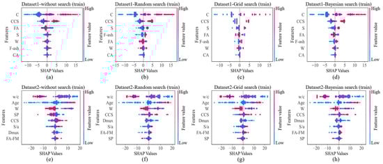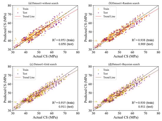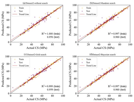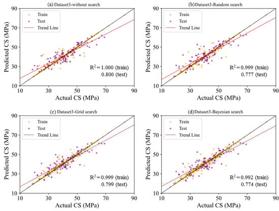 - In Dataset 1, the application of the search algorithm resulted in a significant improvement in the prediction accuracy of the ML model. The R2 value increased while both RMSE and MAE decreased, indicating an overall enhancement in performance. In addition, models incorporating the search algorithm demonstrated a reduced performance gap between the training and test sets, suggesting a lower risk of overfitting.