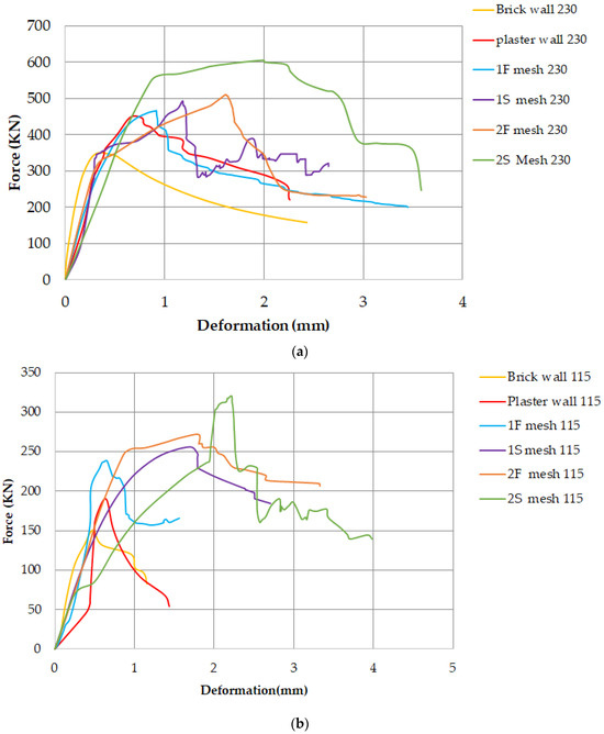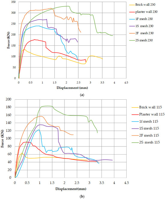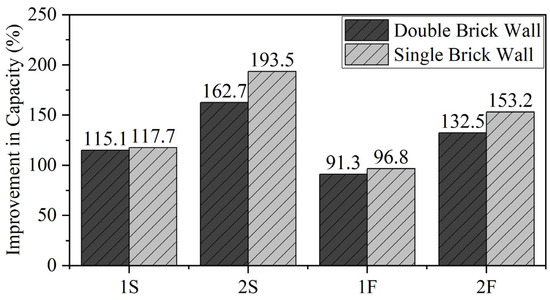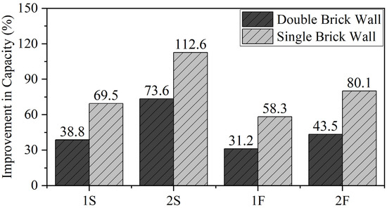 - The use of single-layer steel mesh, fiberglass mesh, and plaster improved the compressive strength of unreinforced masonry walls by 69.54%, 58.28%, and 25.83%, respectively. Additionally, the application of double-layer steel and fiberglass mesh increased the compressive strength by 112.58% and 80.13%, respectively, in single-brick walls. For double-brick walls, the compressive strength was enhanced by 38.76%, 31.18%, and 19.67% with single-layer steel mesh, fiberglass mesh, and plaster, respectively, compared to the control samples. Furthermore, the use of double-layer steel and fiberglass meshes increased the compressive strength of double-brick walls by 73.60% and 43.54%, respectively, compared to unreinforced counterparts. The greater percentage increase in compressive strength in single-brick walls is attributed to the fact that load transfer from the brick to the steel mesh occurs at lower loads compared to the load transfer mechanism in double brick walls.