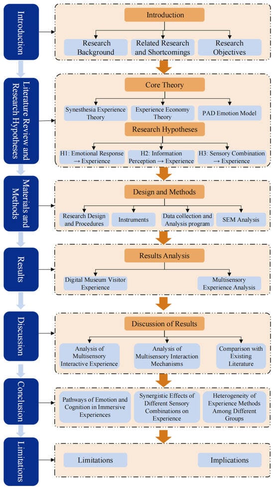 In response to shortcomings in existing research regarding methodological frameworks, evaluation systems, and the balance of ecological responsibility, this paper explores ways to enhance audience emotional responses [] and information perception in digital museums through multisensory interactive design. Figure 1 shows the research roadmap. The specific research objectives include the following points: