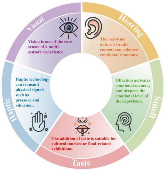 The incorporation of multisensory technologies in digital museums can facilitate a more profound and immersive experience through a skillful integration of these modalities. With regard to visual stimuli, it is of paramount importance to incorporate visual stimulation into immersive experiences. The integration of AR and VR technologies enables the creation of highly realistic environments, which can be further enhanced by incorporating other sensory experiences []. With regard to hearing, the efficacy of auditory perception in enhancing experiences has been substantiated in a multitude of disciplines []. It has been demonstrated that audio design extends beyond the mere provision of background music. Instead, it employs alterations in the direction and volume of the sound source to augment user immersion. The synchronization of sound with visuals has been demonstrated to facilitate the enhancement of emotional responses []. Haptic: The latest developments in haptic technology provide users with tangible physical feedback, enhancing the immersive experience. The latest generation of haptic feedback technology is capable of conveying pressure, vibration, or temperature changes to the user via a wearable device or sensor and is particularly suited for applications in virtual environments []. Olfactory: The sense of olfactory is distinctive in its capacity to evoke emotional and memory-related responses. New olfactory technologies facilitate the release of specific odors in real time during the experience, thereby enabling visitors to more naturally associate the exhibition theme with relevant situations. The sense of taste is unique in its capacity to elicit emotional responses and memories. New technologies are emerging that are able to release specific odors in real time during the experience, allowing visitors to more naturally associate the exhibition theme with relevant situations []. Technologies that facilitate taste experiences are a relatively recent addition to the domain of immersive experiences, yet they have already demonstrated considerable advancement []. As illustrated in Figure 2.