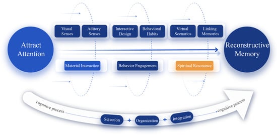 The senses are not merely interdependent, but rather, they exist independently of one another while also complementing each other. The effect of multiple senses acting in concert is greater than that of a single sense. Accordingly, the synesthetic experience is of particular significance in the context of multisensory design. Hiro Ponti previously put forth the notion of “synesthetic experience”, postulating that the establishment of a synesthetic perception environment is a fundamental prerequisite for the creation of an immersive experience []. James Gibson [] posited that multisensory perception activities collectively regulate human movement and behavior in the environment. This illustrates that in multisensory design, the integration of different senses is essential for optimal effect, rather than their operation in isolation [] (Figure 3). At the material level, information is conveyed directly through the senses of sight and hearing. At the behavioral level, the interactive design arouses user habits and stimulates emotional resonance. At the spiritual level, cultural information and emotional elements are incorporated. The elements that have been meticulously restored in the virtual scene resonate with the user’s memories and past experiences. This multisensory design permeates the entire cognitive process, from the initial attraction of attention to the reconstruction of memories, and offers users an unprecedented immersive cultural experience [].