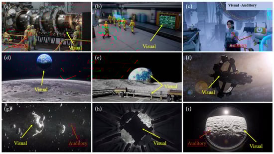 Example of Scene 1—Nine-panel diagram of a space station. Subfigures (a–i) depict different virtual scenes from a space station environment. All scenes fall within the visual–auditory category.